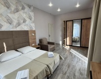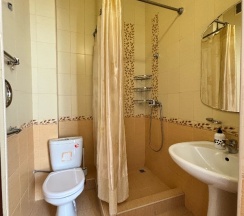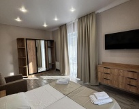 Заселение: мы бронировали номер с кухней ну нам дали без неё ( я не возмущался т.к. все равно номер меня устроил) Расположение: близко от моря, так же в шаговой доступности расположены все сетевые магазины. Номер: у нас был 2 комнатный с двумя балконами. Большой санузел, диван, кресло, кровати со старыми матрасами ( ну я все равно выспался ) в каждой комнате по тв ( в одной тв не работал т.к. не было антенны. На балконе есть стол со стульями. Во дворе есть мангал, столики, общая кухня. В целом все довольно не плохо. В том числе не забываем, что всему своя цена.