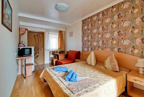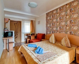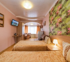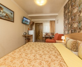 Возможное размещение двух взрослых и ребёнка на дополнительном спальном месте раскладном кресле-кровати. Расположены на втором этаже первого, и на третьем этаже второго корпуса. В номере собственный санузел, телевизор, кондиционер, чайник.