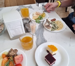 Питание мое почтение! Все очень вкусно, очень сытно. Блюда никогда не заканчиваются, так как персонал всегда выносит новые на смену опустевшим гастроемкостям. Даже когда мы пришли в первый день на обед, до конца которого оставалось 10 минут, мы увидели, что можем попробовать все, что есть меню на сегодня. Очень оценила, что выбор напитков неимоверно огромный. Начиная от нескольких видов чая и кофе, заканчивая соками, морсами, компотами, какао, и несколькими видами газировок.