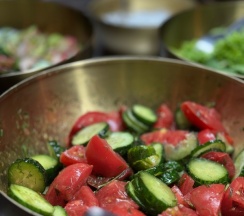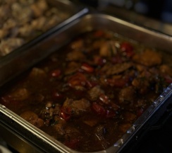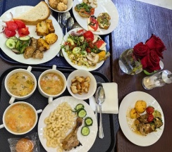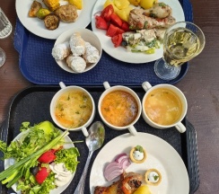Обед: всегда 3 вида супа, как минимум три гарнира, мясо, курица, рыба, овощи, пироги с рыбой или ветчиной, выпечка. Напитки: соки, компоты, вино, коньяк.
