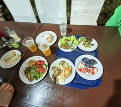 Ужин: всегда горячие мясные блюда, салаты, запеченная рыба, шашлык даже бургеры с курицей! Напитки: все так же вино, коньяк, чай, кофе, соки, коктели, пиво. На каждом ужине, Хозяйка Елена всегда всем превшим детишкам давала сюрпризы: или мороженое, или пирожное, или коктейль.