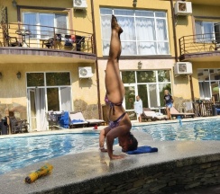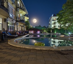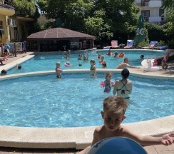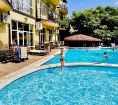На территории два бассейна: детский достаточно большой , но неглубокий и взрослый. Минус взрослого бассейна это глубина не более 1.5 метра по всей длине, но это не мешало освежится всем отдыхающим. Бассейн ежедневно чистят, работает с 10 утра до 11 вечера. Вокруг бассейна много лежаков, беседок, мест для отдыха. Везде много зелени, цветов, кустарников. Территория закрытая, дети случайно не выскочат, около ворот всегда дежурит охрана.