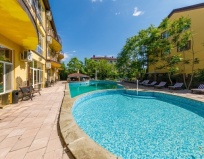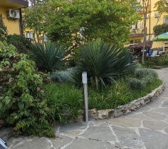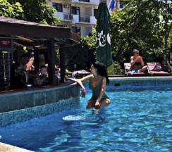 На территории отеля столько зелени, что ощущаешь себя в каком то отдалённом от цивилизации месте, хотя стоит выйти за калитку, как ты попадаешь в каменные "джунгли", где палит солнце. На территории отеля есть БОЖЕСТВЕННЫЙ бассейн, он расположен в таком месте, где всегда солнечно. По периметру расставлены лежаки с матрасами. Ты можешь выбрать место под солнцем, или расположится в уютном, прохладном теньке. Территорию охраняют серьёзные ребята, которые не выпустят твоего ребёнка без родителя, даже под дулом пистолета. Очень, в наше время ценно. Можно отдыхать не задумываясь о безопасности. В 5-7мин. ходьбы от отеля находится БОЖЕСТВЕННЫЙ пляж. Это наверное единственный пляж в округе, где лежаки (бесплатные) с матрасами, просто блаженство. Пляж огороженый, чистый, лежаков всегда достаточно.