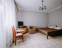 2 взрослых и 2 детей. Номер полулюкс включает просторную комнату на третьем этаже с тремя кроватями одна большая и две маленькие. В комнате шкаф, прихожая, телевизор, тумбочки, балкон с столиком и стульями, холодильник. Ванна оборудована душевой, раковиной, беде, полотенцами.