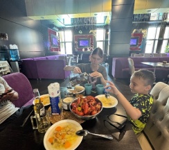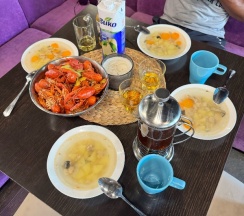 Шли с моря с детьми, решили пообедать. Очень вкусный суп-лапша , детям понравился и самое вкусное - это блины со сгущёнкой! Детям очень понравилось