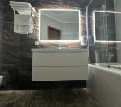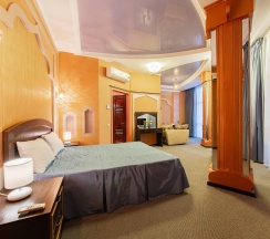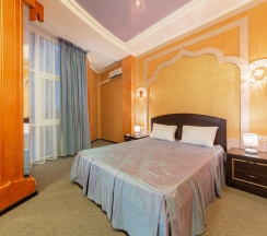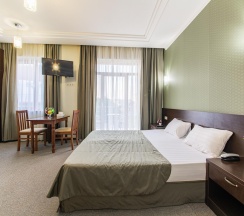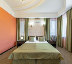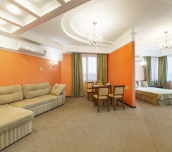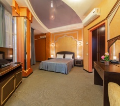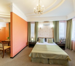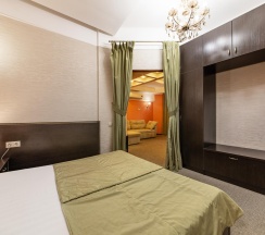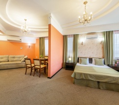 В номере имеется: двуспальная кровать и диван, шкаф-купе, стол, стулья, туалетный столик, прикроватные тумбочки, набор посуды, санузел, душевая кабина, фен, утюг, полотенца, мыло, туалетная бумага, ортопедические матрасы, цифровое ТВ, сплит-система, сейф, холодильник, телефон. Возможны 2 дополнительных места.
