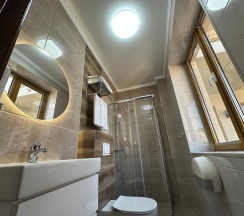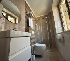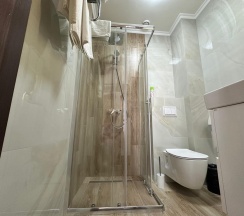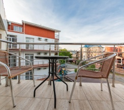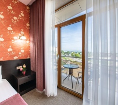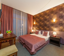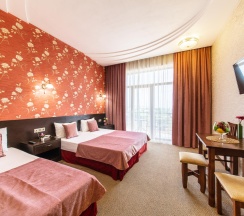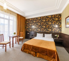 В улучшенном номере имеется: одна двуспальная кровать или две полуторные кровати, шкаф-купе, стол, стулья, прикроватные тумбочки, набор посуды, санузел, душевая кабина, полотенца, мыло, туалетная бумага, ортопедические матрасы. Балкон отдельный, с видом во двор отеля и на бассейн, на балконе стулья; цифровое ТВ, сейф, сплит-система, холодильник, телефон.
