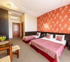 В трёхместном номере имеется: одна двуспальная и полуторная кровать, или три полуторные кровати, шкаф-купе, стол, стулья, зеркало, прикроватные тумбочки, набор посуды, санузел, душевая кабина, полотенца, мыло, туалетная бумага, ортопедические матрасы, цифровое ТВ, сейф, сплит-система, холодильник, телефон.