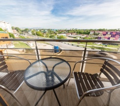 В номере имеется: две двуспальные кровати и диван, два шкафа-купе, стол, стулья, прикроватные тумбочки, набор посуды, санузел, ванная, фен, утюг, полотенца, мыло, туалетная бумага, ортопедические матрасы, на балконе (балкон с видом на двор отеля и бассейн): стол, стулья; цифровое ТВ, сплит-система, сейф, холодильник, телефон. Возможны 2 дополнительных места.