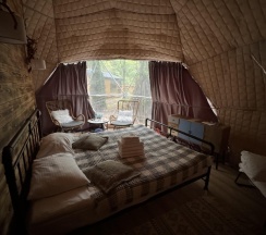 Заселились сначала в глемпинг. Там очень чисто и красиво, полноценная ванная комната, удобные спальные места. Но шел сильный дождь уже несколько дней, было некомфортно из-за излишней влажности. Нам предложили переехать в домик.