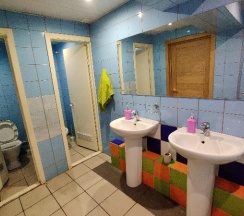 Брали номер со своей ванной комнатой, душевая отличная, жидкое мыло, полотенца прилагаются. В номере телевизор и чайник. За такие удобства переплата небольшая.