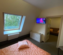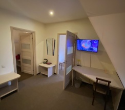 Комфортный и чистый двухкомнатный номер. Присутствует всё необходимое: два телевизора, холодильник, чайник(по запросу). В достаточном кол-ве санитарно-гигиенические принадлежности. На этаже кулер. Присутствует гладильная зона.
