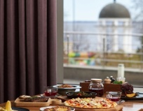 Завтрак отличный - куча всего, очень вкусные домашние блинчики с замазкой из форели)))