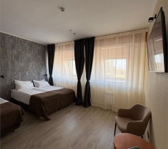 Отель предлагает комфортабельный номер с двумя односпальными кроватями, оформленный в современном стиле с преобладанием тёплых тонов. Уютную атмосферу создаёт мягкое освещение и стильные элементы интерьера. Большое окно с лёгкими занавесками обеспечивает естественное освещение и придаёт пространству свежесть. В номере предусмотрена зона для работы с письменным столом и удобным стулом.