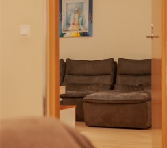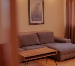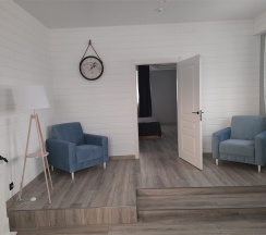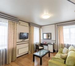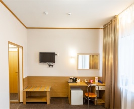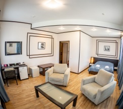 Комфортабельный номер, выполненный в светлых тонах, предлагает уютное пространство для отдыха. В гостиной зоне расположены мягкие кресла и журнальный столик, что создаёт приятную атмосферу для общения или чтения. Большие окна с элегантными шторами обеспечивают хорошее естественное освещение. Спальня оборудована удобной двуспальной кроватью, что способствует полноценному отдыху. В номере также присутствует современная ванная комната, оформленная в нейтральных тонах; она оснащена необходимыми удобствами для комфортного пребывания.