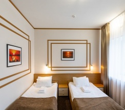 Номер оформлен в светлых, нейтральных тонах, что создает атмосферу уюта и спокойствия. Две односпальные кровати обеспечивают комфортный отдых, а большие окна наполняют комнату естественным светом. На стенах размещены стильные декоративные элементы, добавляющие интерьеру изысканности.