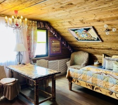 Просторная комната оформлена в благородной бежевой цветовой гамме. Отлично подойдет для семейного отдыха, кроме большой двуспальной кровати есть два удобных дивана, кресла и большой обеденный стол. Собственная ванная комната с душевой кабиной оборудована подогревом пола. Старинный письменный стол и электрокамин добавят приятные впечатления.