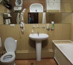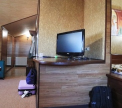 В нашем мансардном номере (необычной планировки) было чисто и уютно, все в полном комплекте (полотенца, тапочки, ванные принадлежности).