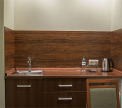 Однокомнатный номер площадью 42 квадратных метра разделен на удобную рабочую зону с чайной станцией и комфортную спальню.