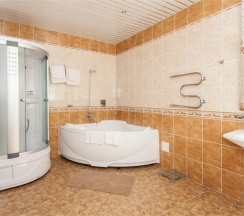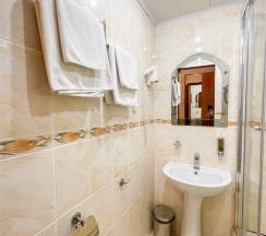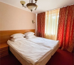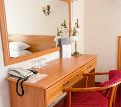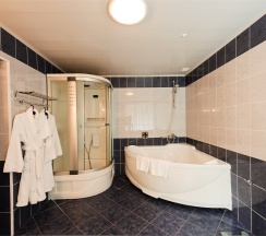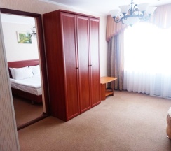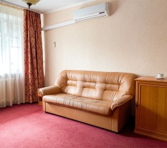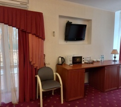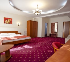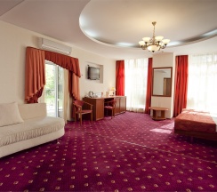 В номере: Двуспальная кровать "King size" (180*200), туалетный стол с зеркалом, полка для багажа, телевизор, телефон, холодильник, стол, 3 стула, шкаф, диван, ванна, биде, фен, туалетные принадлежности, махровый халат, тапочки.