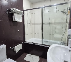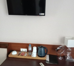 Про сам номер. В номере все, как дома, чисто, уютно, светло. Немного смущал табачный запах с балкона, но мы его не закрыли. В номере есть все: тапочки, халаты, полотенца, зубные щетки, чашки, чайник, чай, вода, холодильник. Да что там, даже будильник есть! Все кристально чисто в номере. Есть ванна. Есть освежитель воздуха, есть туалетная бумага с запасом, а также мыло, гели, шампуни. Постель белоснежная.