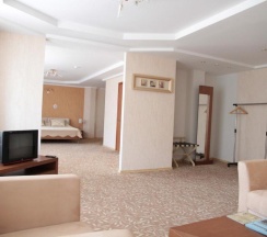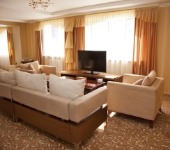 Номер разделен на три просторные комнаты - спальня, гостиная и чайная зона. Отличительной особенностью данного номера является красивый интерьер, дорогая и комфортабельная мебель. В номере имеется два ЖК-телевизора, два холодильника, два больших вместительных шкафа, ванна с гидромассажем, а так же дополнительный санузел для гостей.