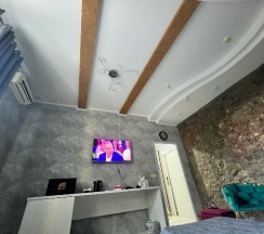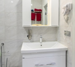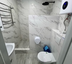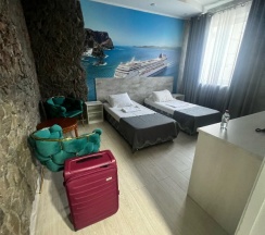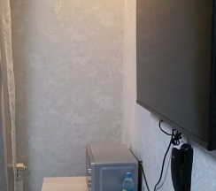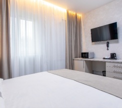 Бронировали через авито на сутки по возвращению с моря. Приехали, заселись, все очень быстро. Шикарный номер, удобное месторасположение. В номере большая кровать, угловой диван, есть офисные стол и кресло. Приехали, заселились. В номере чисто, аккуратно. Все необходимое для душа, тапочки, халаты. Рядом достачное количество общепита, магазин "Реми" Парковка под окном. Чайник, микроволновая печь, гладильная доска, утюг, минихолодильник . Очень удобно, что не выходя из номера есть возможность и позавтракать и погладить. На этажах куллеры . Удобный номер для тех кто едет по работе. Есть зона, где поработать и где отдохнуть и где пообедать. Единственное, что по мне небольшой круглый обеденный столик и два стула были бы неплохим дополнением.