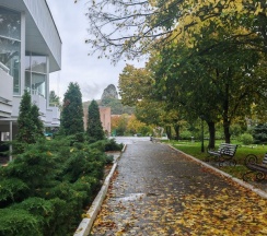 Красивая территория, много лавочек, качелей для отдыха, хорошее питание. Вечером подсветка дорожек. Собственный бювет с минеральной водой) Рядом аллея любви.