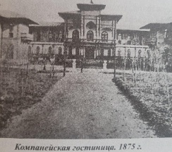 Казенная гостиница. Одна из первых в Ессентуках. Первая находилась на другой стороне Курортного парка. На фото видна почтовая станция. 1880-е. В разные годы называлась Компанейской/Старая казенная/Свердлова-Санаторий №21/ВЦСПС/Цусстраха