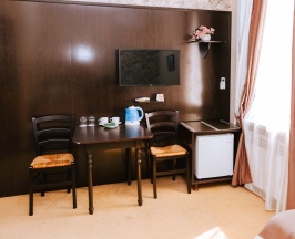 Услуги и удобства: Кондиционер, Рабочий стол, Отопление, Ковровое покрытие, Шкаф/гардероб, Душ, Туалетные принадлежности, Туалет, Ванная комната, Кабельные каналы, Телевизор с плоским экраном, Холодильник