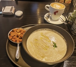 Ресторан: еда божественная, подача и оформление на хорошем уровне. Сегодня ела грибной суп пюре, ела и сама себе говорила, как же готовят вкусно и так красиво😊🩷🩶🤍