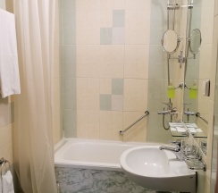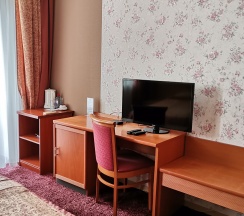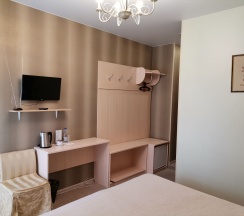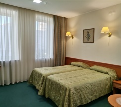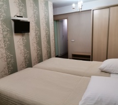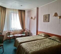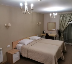 Просторный номер, площадью 18-22 кв.м, исполненный в классическом стиле, «Стандарт», имеет все необходимое для комфортного пребывания. Две полутороспальных кровати с ортопедическим матрасом, удобными перьевыми подушками (при необходимости заменяются на гипоаллергенные) и постельное белье из 100% хлопка обеспечат Вам идеальный сон. Беспроводной интернет и удобный рабочий стол позволят Вам сконцентрироваться на работе, ведь вы можете быть уверены – ничто не нарушит Ваш рабочий процесс. Для каждого гостя предоставляются банный набор, вода, чай. Ежедневная уборка проводится по Вашему запросу.