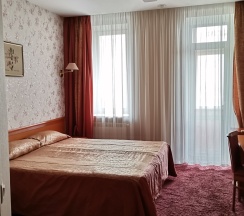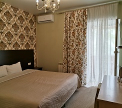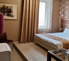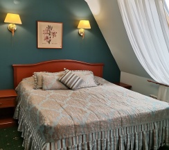 Просторный номер, площадью 20-25 кв.м, исполненный в классическом стиле с оригинальной дизайнерской выдумкой. Номер «Комфорт», имеет все необходимое для комфортного пребывания. Большая двухспальная кровать с ортопедическим матрасом и качественным постельным бельем из 100% хлопка, удобными перьевыми подушками(при необходимости заменяются на гипоаллергенные) обеспечат Вам идеальный сон. Беспроводной интернет и удобный рабочий стол позволят Вам сконцентрироваться на работе, ведь вы можете быть уверены – ничто не нарушит Ваш рабочий процесс. Для каждого гостя предоставляются банный набор, вода, чай. Ежедневная уборка проводится по Вашему запросу.