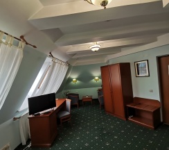 Большой номер, площадью 30-35 кв.м. Номер "Студия" - просторный номер с повышенным уровнем комфорта. В просторной комнате располагается большая двуспальная кровать с ортопедическим матрасом, удобными перьевыми подушками(при необходимости заменяются на гипоаллергенные) и постельное белье из 100% хлопка обеспечат Вам идеальный сон. Кофейный столик с удобными креслами или пуфиками, большая и удобная ванная комната дополняю уют номера. Беспроводной интернет и удобный рабочий стол позволят Вам сконцентрироваться на работе, ведь вы можете быть уверены – ничто не нарушит Ваш рабочий процесс. Для каждого гостя предоставляются сейф в номере, банный набор, вода, чай. Ежедневная уборка проводится по Вашему запросу.