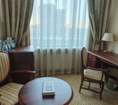 Интерьер для любителей антуража в стиле высоких приемов советской номенклатуры. Красные ковры , тяжелая мебель из массива и т.д. Все, конечно, очень старое, но чистое и аккуратное. Персонал под стать интерьеру - с суровыми напряженными лицами в основном. Брали два номера на 11 и 14 этажах. И там и там ночью просыпались от лая собаки. То ли это была одна собака, то ли на каждом этаже по собаке )