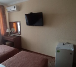 Номер небольшой, но все необходимое есть: холодильник, фен, кондиционер.