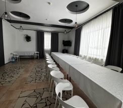 На первом этаже есть кухня , большой зал со столами и стульями , примерно на 20-25 человек .