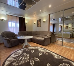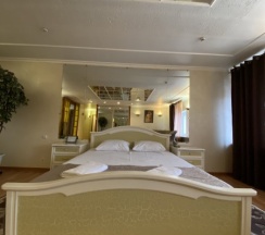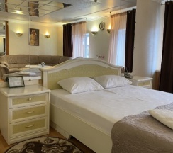 большой номер с сауной и джакузи включает в себя большую двухспальную кровать ,угловой диван ,кресло,круглый обеденный стол,шкаф для одежды,телевизор,холодильник,чайные принадлежности и столовые приборы,чайник,питьевую воду;в зоне сауны имеется душевая кабина ,сауна и ванна джакузи,полотенца,халаты,тапочки,шампунь и мыло; в туалетной комнате_унитаз,биде,раковина и фен.