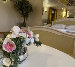 номер для проживания двух человек включает в себя большую 2х местную кровать,журнальный столик,туалетный стол.В номере имеется конденционер,телевизор, шкаф для белья,холодильник,чайные принадлежности,чай,чайник.Туалетная комната с душем,туалетными принадлежностями(мыло,шампунь).полотенцами.феном.За дополнительную плату предоставляются халат,одноразовые тапочки.