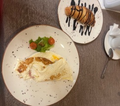 Бронировали коттедж Охотничий. При заселении нас встретила приветливая администратор Александра. Она помогла нам разместиться, рассказала всё про коттедж и что если мы захотим с утра покушать, можно будет прийти в ресторан и заказать завтрак. Также она всегда была на связи. Очень красивое и спокойное место на природе, весь персонал приветливый. А на завтрак мы всё таки пришли. Всё очень понравилось, повара знают своё дело, к сожалению фотографии завтрака нет, но даже по оформлению можно понять, что они любят своё дело и готовят с любовью! Коттедж тоже понравился, там можно сходить в финскую парную и хамам. Всем советую это место, если хотите отдохнуть от работы и прогуляться на природе, далеко не уезжая из города!