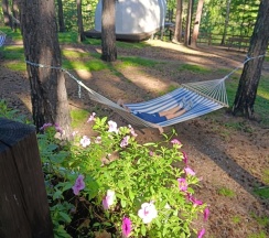 Очень приятное место. Уютные и просторные домки, сосновый лес, кролики по территории бегают, олени есть, лисы, еноты. Бассейн с теплой водой под открытым небом