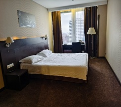Номер чистый, постельное бельё качественное. Вкусные завтраки, есть разнообразные блюда и напитки. Очень классный бар Тайга с местной кухней и сибирскими напитками. Вежливые девочки на ресепшене. Единственное расстроил набор в ванной. Один шампунь и гель для душа в одноразовой упаковке и зубной набор, мыло в диспансере и всë. Жалко, что на панорамный этаж можно зайти только во время работы ресторана. Вид из номера вечером просто 🔥.