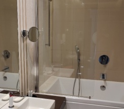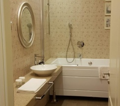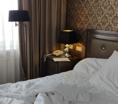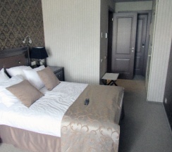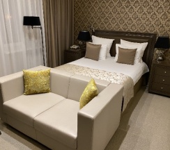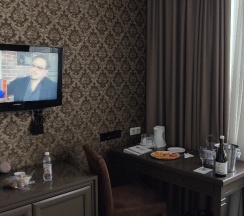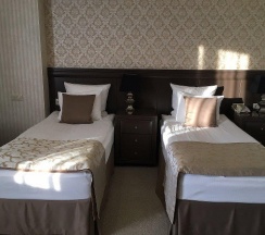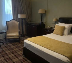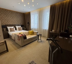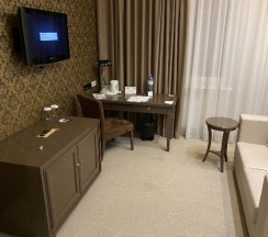 Качество-цена порадовали👍 отличный одноместный номер, кровать 1*1,8 вполне достаточна для сна 1 человека. В номере - халат, тапочки, кондиционер, туалетные принадлежности, чайник (2 кружки 2 стакана, чай, сахар кофе растворимый, вода), вайфай и тв. Завтраки включены, разнообразный шведский стол, голодным никто не останется😊 своя кондитерская при отеле, лобби-бар. Расположение очень удачное - в самом начале набережной, у моста влюбленных. 5 из 5.