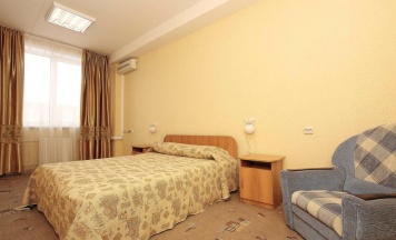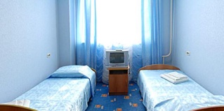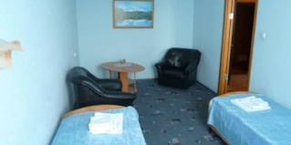 В номере: две односпальные кровати и диван, либо три односпальные кровати, тумбочки, телевизор, чайник, телефон, стол, стулья, шкаф для одежды.