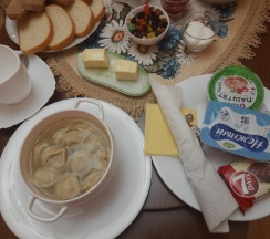 С утра накормили чудесным завтраком, который был включен в стоимость. Все очень вкусно, как дома и даже лучше. Яичница с колбасой, сыр, масло с хлебом, йогурт, сливки и зелень к яишнице. Просто класс!