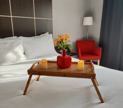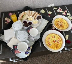 Отдельное спасибо за подарок молодоженам, отель предоставляет номер на сутки, то есть после банкета, можно проводить гостей и расслабиться в уютном комфортном номере. Номера чистые, со всеми удобствами, гигиеническими принадлежностями (зубные щетки, паста, шампунь, гель для душа), тапочки, халаты, чистая вода, чайник, чай, кофе. Так же был комплимент в виде бутылки шампанского и тарелочки с сыром и виноградом, а на следующий день очень вкусный завтрак из нескольких позиций, включая десерт и чай/кофе на выбор)))
