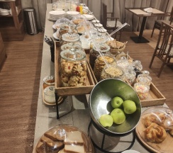Завтраки неплохие, без изысков, но достаточно разнообразные. Понравилась лаунж-зона, которая входит в стоимость проживания: с 13:00 до 00:00 там можно бесплатно взять напитки и легкие закуски. Удобное место, чтобы перекусить или поработать в неформальной обстановке.