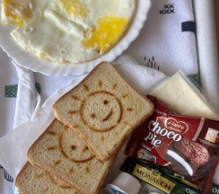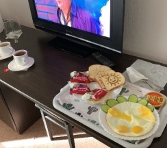 Гостеприимство - 5 (даже я - конфликтный мелочный придирчивый человек - не сумел поконфликтовать). Завтрак - 5 (жене понравилась подача со смайликами на хлебе))). Оборудование в номере - 3 (масса недочетов: например, стремянка в шкафу в прихожей, отсутствие лампочки в бра-светильнике, посторонний хлам на балконе; плюсы - работает ТВ и пульт к нему, есть горячая вода, одеяло и т.п.)