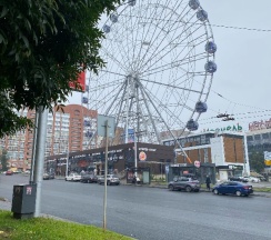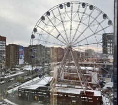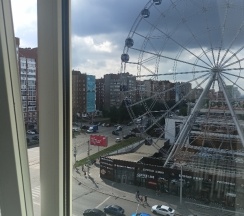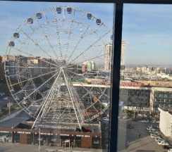 Отель имеет три звезды. Номер выбрали двухместный стандарт. Номер чистый, есть всё необходимое для комфортного отдыха. Из окна открывается вид на одноимённый торговый центр и колесо обозрения. Особенно красиво вечером, когда есть подсветка.