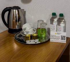 Ванная комната чистая, проблем с горячей водой не было, есть халаты, чистые полотенца, одноразовые принадлежности и фен, самая важная вещь по утрам для девушки. В качестве бонуса на столе есть чаи, вода и куда же в Башкирии без мёда.